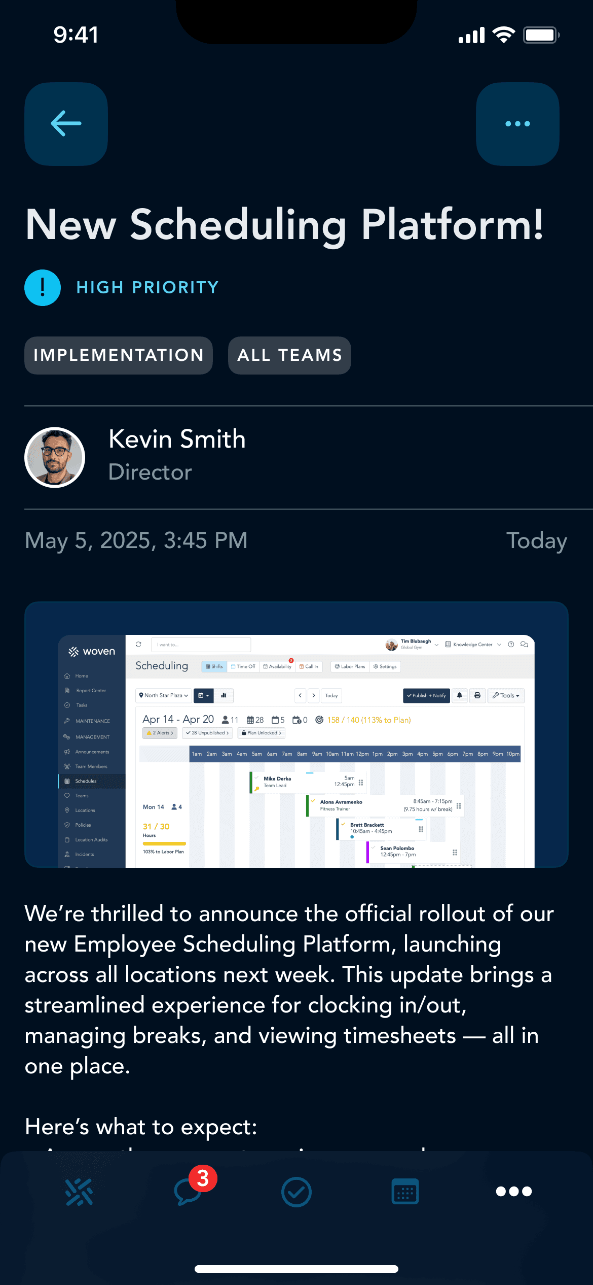 Use Announcements to send updates to the right people at the right locations instead of risking confusion in noisy group messages.